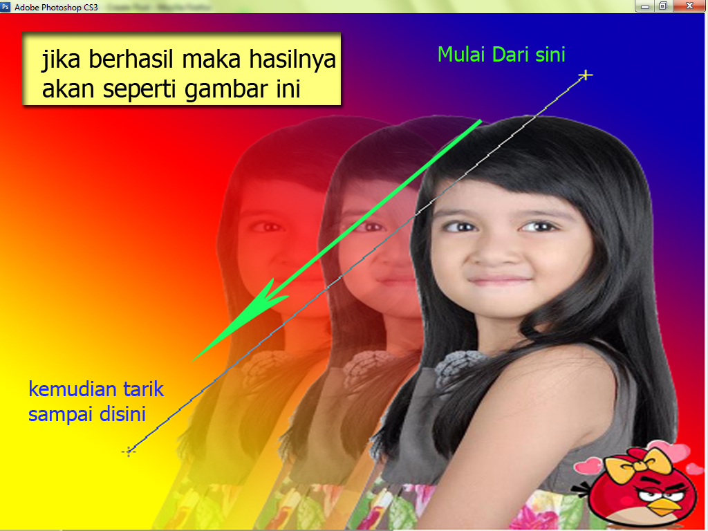 sebenarnya sampai disini efek 1000 bayangannya sudah jadi, tapi agar lebih menarik lagi Penulis akan membuat backgroundnya lagi, kita bisa menggunakan Gradient Tool untuk mewarnai gambar. tapi sebelumnya kita buat dulu backgroundnya di bawah layar 1 klik new layer. lihat contoh gambar di bawah